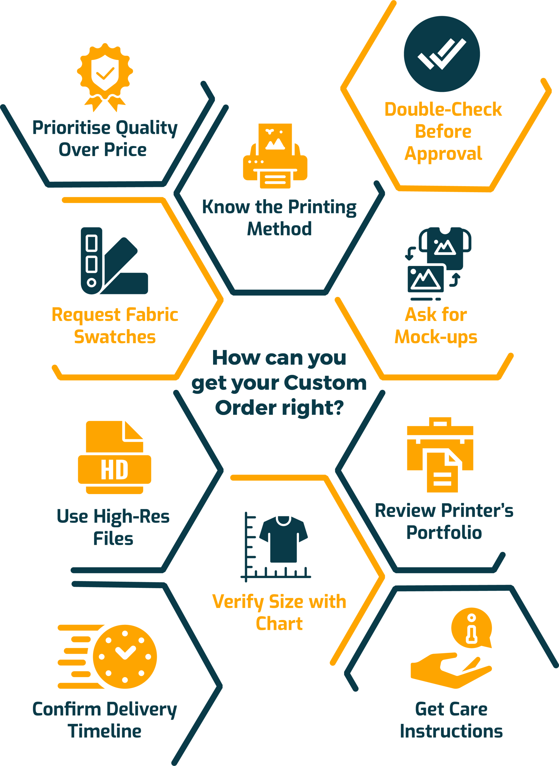 Ignoring proof approval might look like a shortcut to get your order done, but it would lead to an expensive error, especially when working with a large batch. For a big batch of customisation, consider a physical proof to get a better idea of how your shirt or other apparel will look and ensure the fabric quality meets your liking. For a small order, you can go for a digital mock-up. Physical and digital proofs or simple design assistance will give an idea of alignment, colour combination, misspelt text and how the actual final product will look.